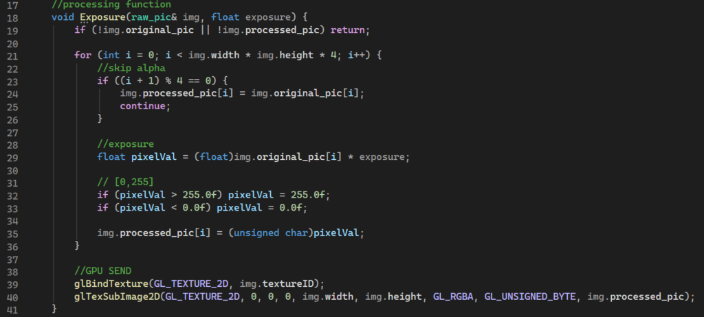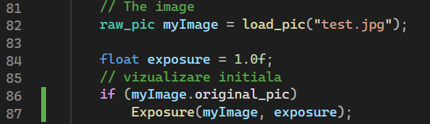 Ne vom ajuta de o functia pentru acest calcul. Ea va fi de tip void deoarece nu imi doresc sa mi returneze ceva, ci sa imi prelucreze niste date. Deoarece doresc sa pastrez valorile modificate ale imaginii sunt nevoit sa folosesc transferul prin referinta raw_pic& img. Este de asemena si mai efficient, caci nu mai este creata o copie la apelarea functiei. Al doilea argument este evident expunerea.