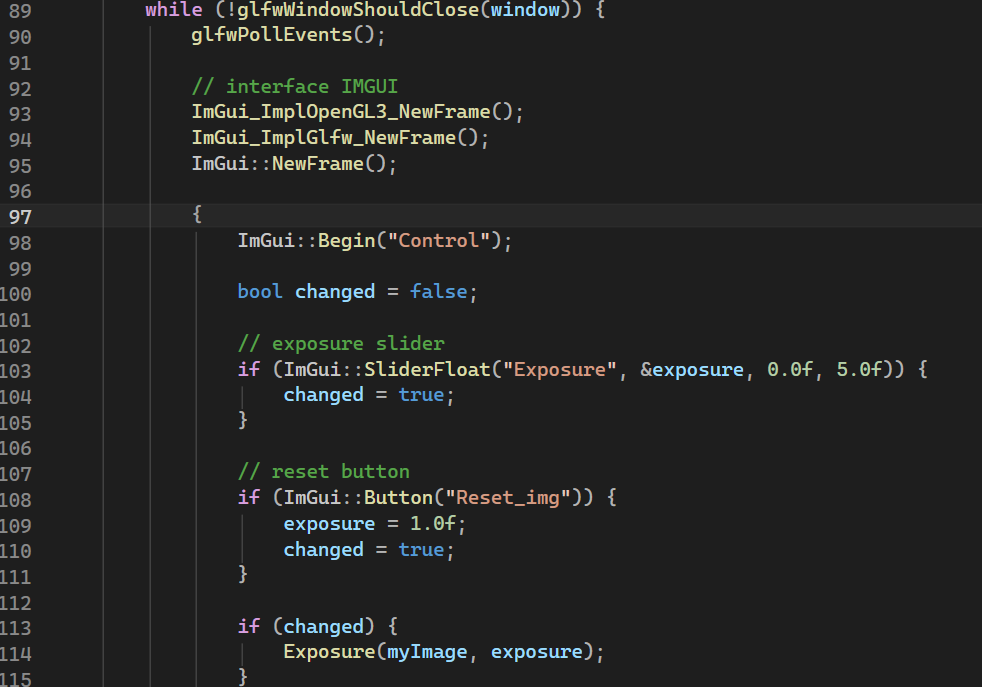 Tot ce facem este sa cream fereastra unde vom rula aplicatia cat si slider-ul cu care vom modifica expunerea. Functiile din if (myImage.textureID != 0) {…} au rolul de a imcarca corect imaginea.