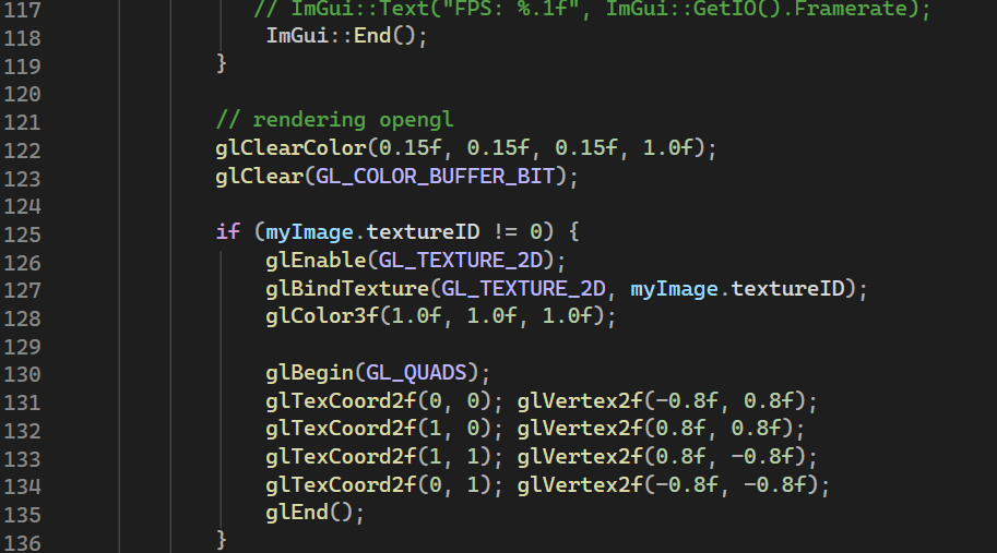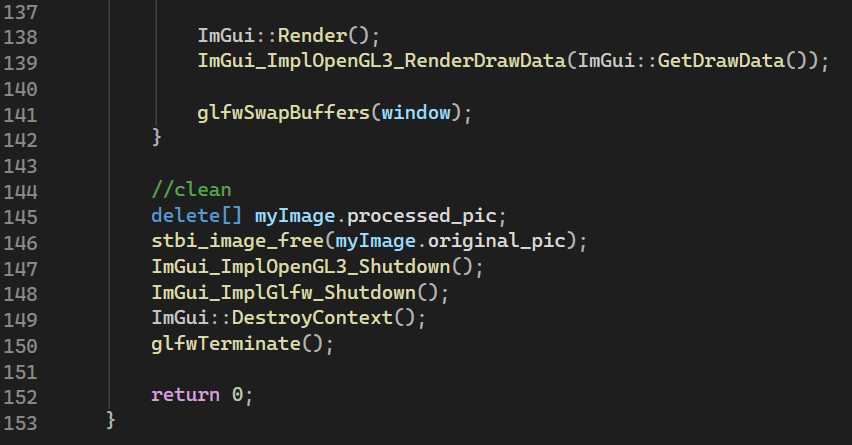 ImGui_ImplOpenGL3_RenderDrawData(ImGui::GetDrawData()) : executa desenarea interfetei ImGui. Acest ape, trebuie pus dupa desenarea pozei, altfel el va aparea in spatele pozei.
